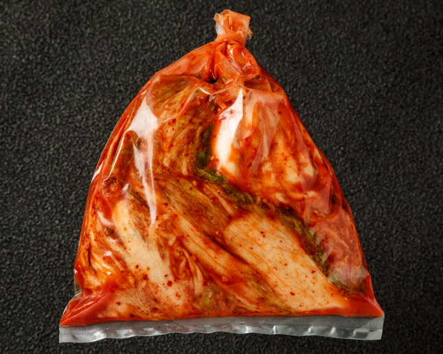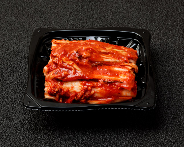 株つきのまま漬けた、食べごたえ満点の白菜のキムチ。白菜の甘さと辛みが絶妙な逸品。